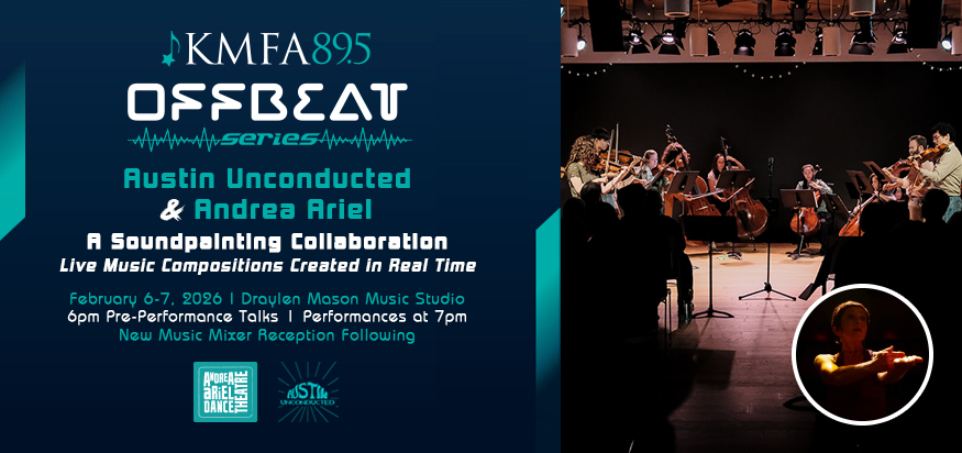 KMFA Classical 89.5’s Offbeat Concert Series continues its commitment to adventurous, boundary-pushing performance with an extraordinary new collaboration between Austin Unconducted and Andrea Ariel Dance Theatre. A Soundpainting Collaboration of Live Music Compositions will take place Friday, February 6 and Saturday, February 7, 2026, at the KMFA Draylen Mason Music Studio (41 Navasota Street), presented in collaboration with Andrea Ariel Dance Theatre as part of the KMFA Offbeat Concert Series. Tickets on sale now and are available at kmfa.org/offbeat.